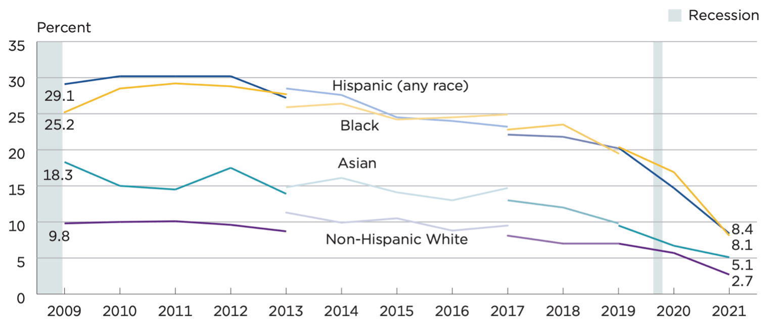 Since 2009, child poverty rates have decreased dramatically across all races.