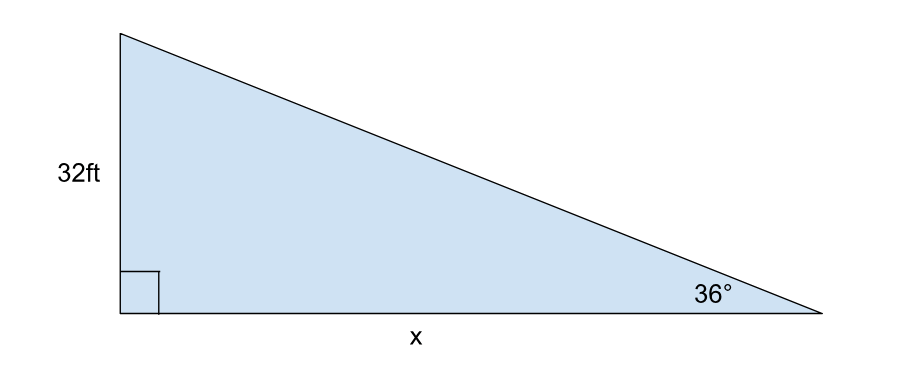 A hiker is looking at a tree with an angle of elevation of 36°. The tree is 32ft tall. How far is the hiker from the tree? Round to nearest whole number.