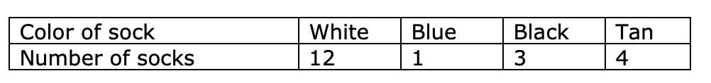 You shoved all of your socks in a drawer. You have white, blue, black, and tan socks. You randomly choose a pair of socks from your drawer without looking. What is the P(white or black)? Give your answer as a percent.