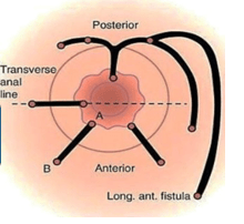 Fístulas anteriores a la línea transversal tienen trayecto recto y las posteriores tienen trayecto curvo