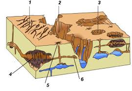Indica a qué se refieren los números 3, 4, 5 y 6 del siguiente dibujo. ¿Qué proceso geológico da origen a las estalactitas y estalagmitas?