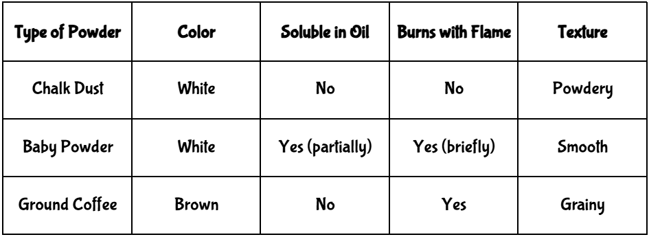 A student believes the identity of an unknown powder is baby powder. Which of the following tests would be most helpful in confirming the identity of the powder?