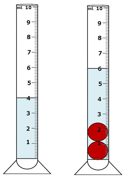 4mL of water was added to the graduated cylinder. After we drop in the object, the new water level goes up to 6 mL. What is the volume of the red Balls?
