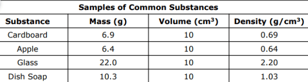 The density of water is 1.0 g/mL. Which of the following substances would SINK when placed into a container of water?