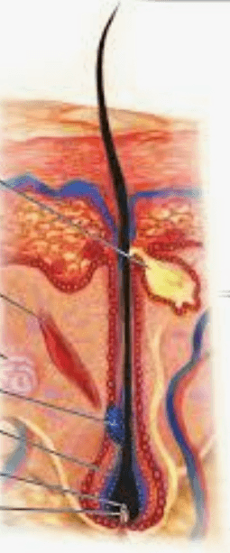 Follicle, bulb, dermal papilla, arector pili muscle and sebaceous glands