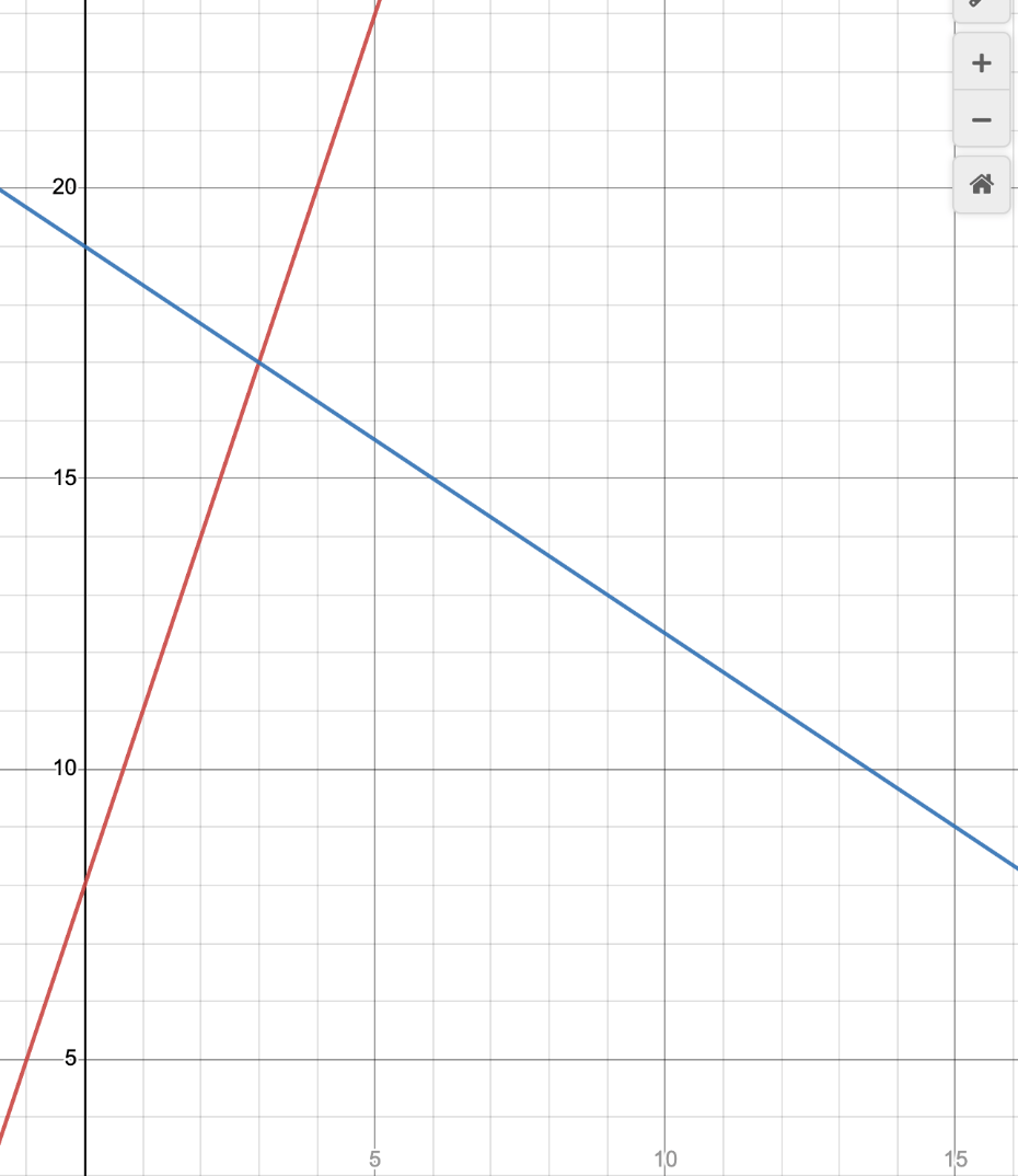 What is the point of intersection? Also, what are the two equations of these lines?