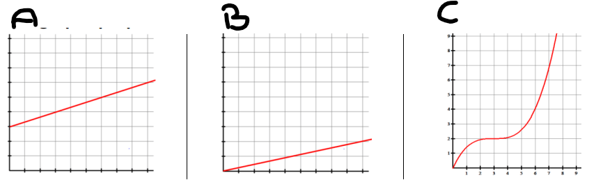 The picture shows 3 graphs.  List all graphs that are proportional explaining how you know. If there are none explain how you know that.