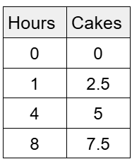 Jim was told to make a proporitonal table showing how many cakes a store bakes per hour.  The store bakes 25 pies in a 10 hr day.  The table he made is below. Did he make the table correctly, explain your logic.
