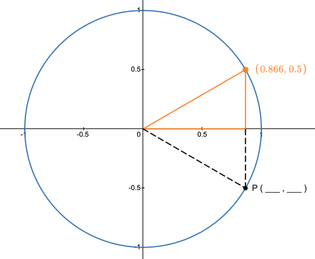\text{Point }P=(\frac{\sqrt(3)}{2},-\frac{1}{2})