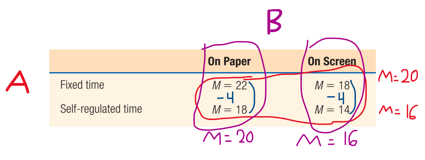 Explanation: Find the average for each row and if there is a difference between the means, there is a main effect for A. There is a 4 point difference between the first and second means.