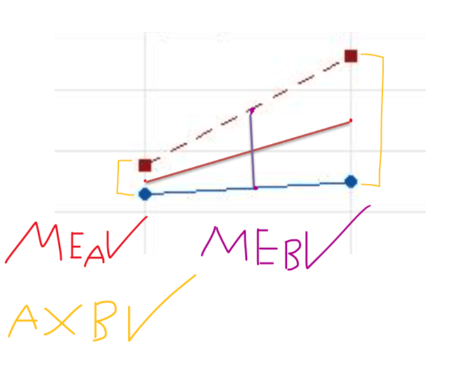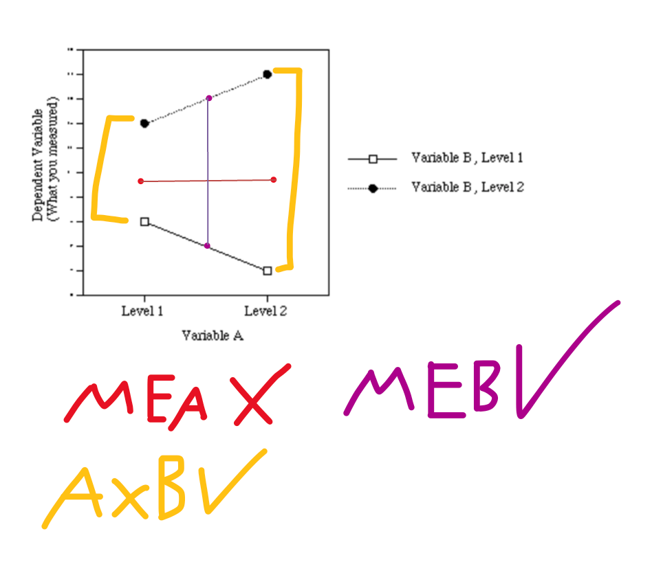 Explanation: Find the average for each column and if there is a difference between the means, there is a main effect for B. If you look closely, you will see that it's using the same values as the ones we found with A. There is a 4 point difference here too. There is a main effect for B.