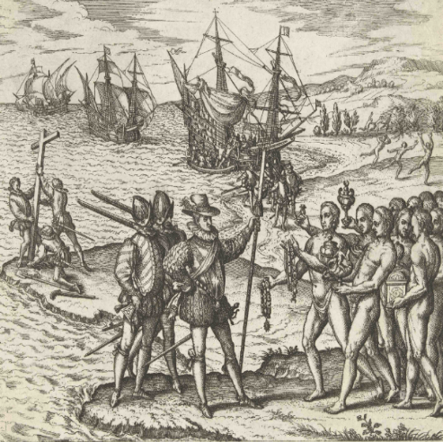Is this a primary or secondary source ? Why ? Engraving (Drawing) by Theodore Debry (1592) showing Columbus arriving in the New World (Americas) as a powerful person who came to colonize the land and the people.