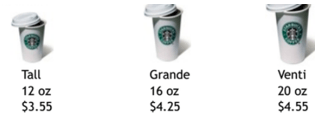 Ms. Gonzalez, Ms. Stevenson, Mrs. Lunar bought different sized Starbucks coffee cups. This person paid the least per ounce and this is how much she paid.