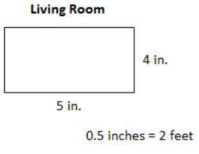A home decorator is adding new flooring to a living room using the blueprint below. What is the actual area of the living room?
