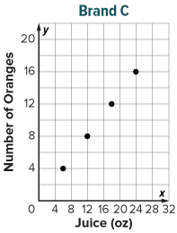 Juice Brand A advertises that it has 10 oranges in its 24-ounce juice carton. The advertised ratios of the number of oranges to ounces for two other juice brands are shown in the table and graph.