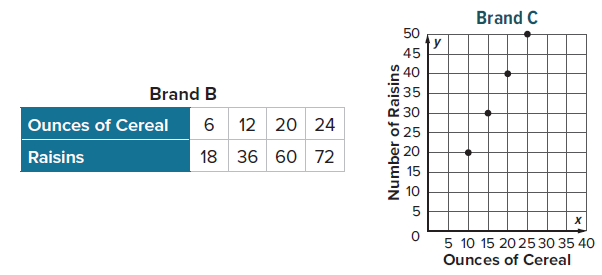 Cereal Brand A advertises that they have 60 raisins in their 24-ounce box of cereal. The advertised ratio of raisins to ounces for two other cereal brands are shown in the table and graph.