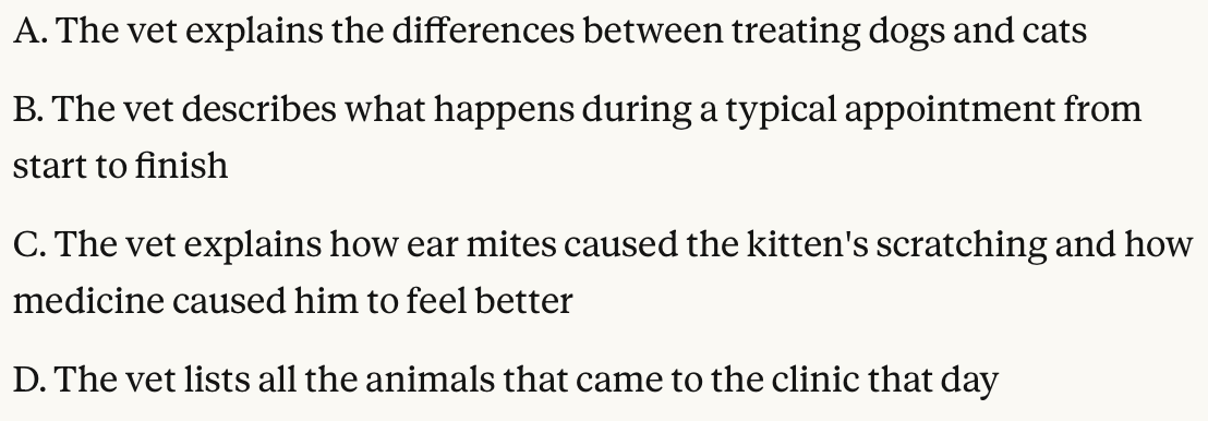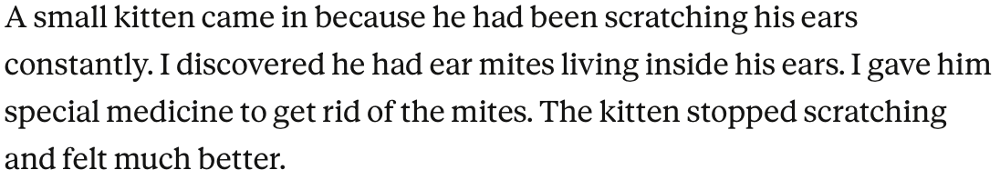 The vet explains how ear mites caused the kitten's scratching and how medicine caused him to feel better.