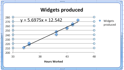 The equation of best fit is given, what would be the predicted number of widgets produced for 48 hours of work?
