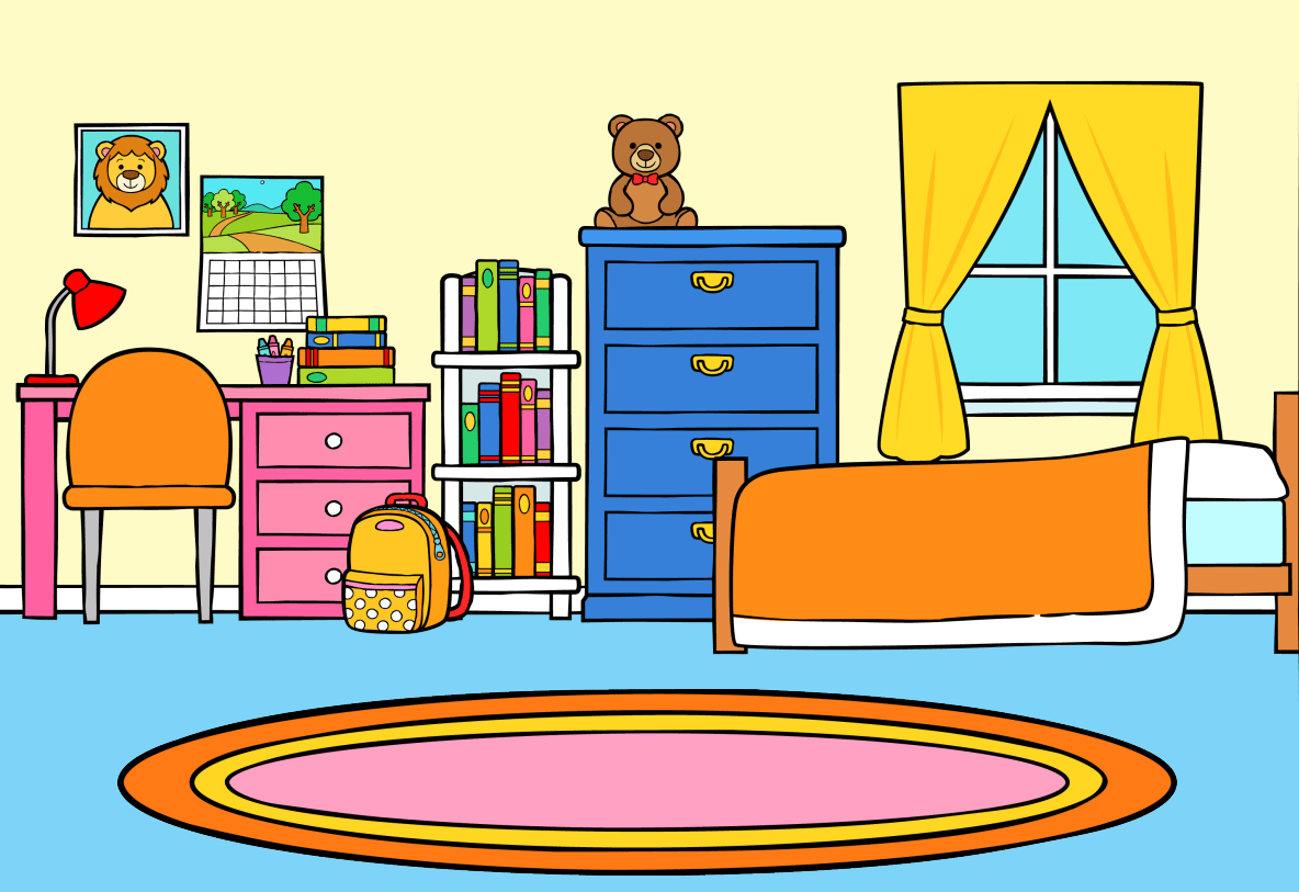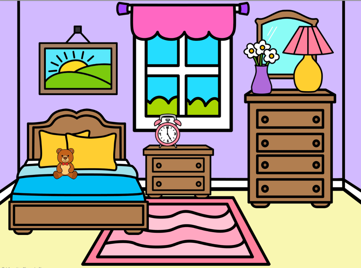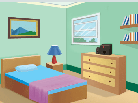 Describe dos cosas en el dormitorio. Usa la palabra "Hay."