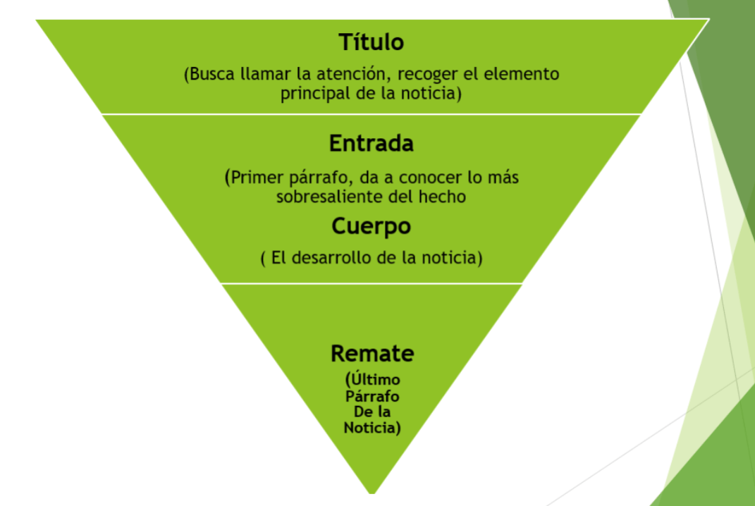 Incluye un titulo llamativo y de gran impacto; la entrada en el primer párrafo, en la que se contestan las seis preguntas básicas del periodismo; el explicaciones del acontecimiento; y el rente es el finax o conclusion. el objetivo de esta estructura es que el lector pueda de manera rápida informarse de las noticias de todo el periódico leyendo solamente las entradas.