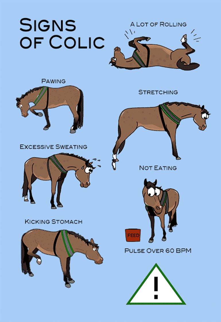 Mencione tres síntomas en que sospecharías que el caballo tiene un cólico.