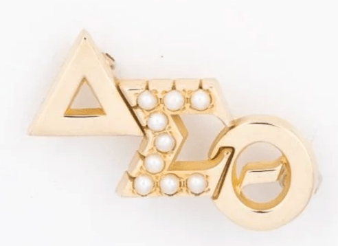 Created by  Big Sister Madree Penn White, includes the three Greek letters, contains the 9 Jewels on the Sigma, and the four corners contain pearls.