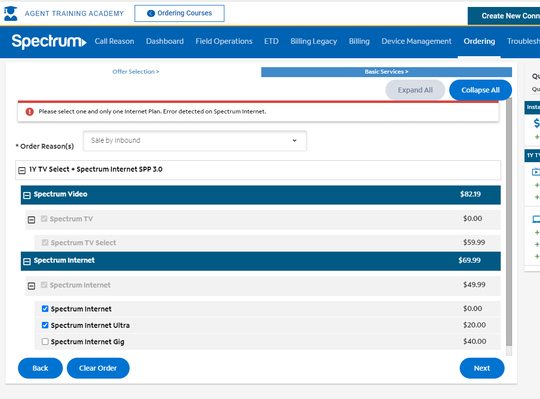 Error: Please select one and only one Internet Plan. Error detected on Spectrum Internet.