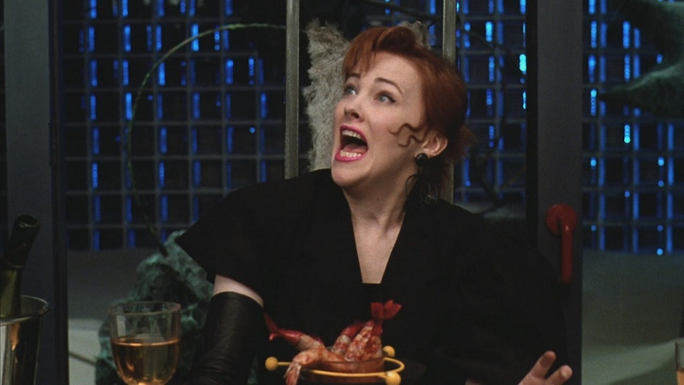 She is pale and has red hair. She has pink lipstick, a black dress, black earrings...