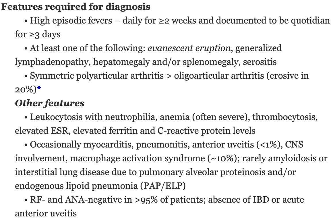 Name the diagnostic criteria for Still disease