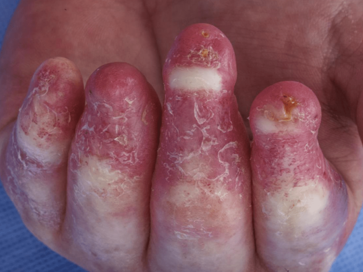 - refractory leg ulcers (can be multifactorial from PG, medium-sized vessel vasculitis, venous hypertension, immobilization, neuropathy, or palisaded neutrophilic and granulomatous dermatitis)