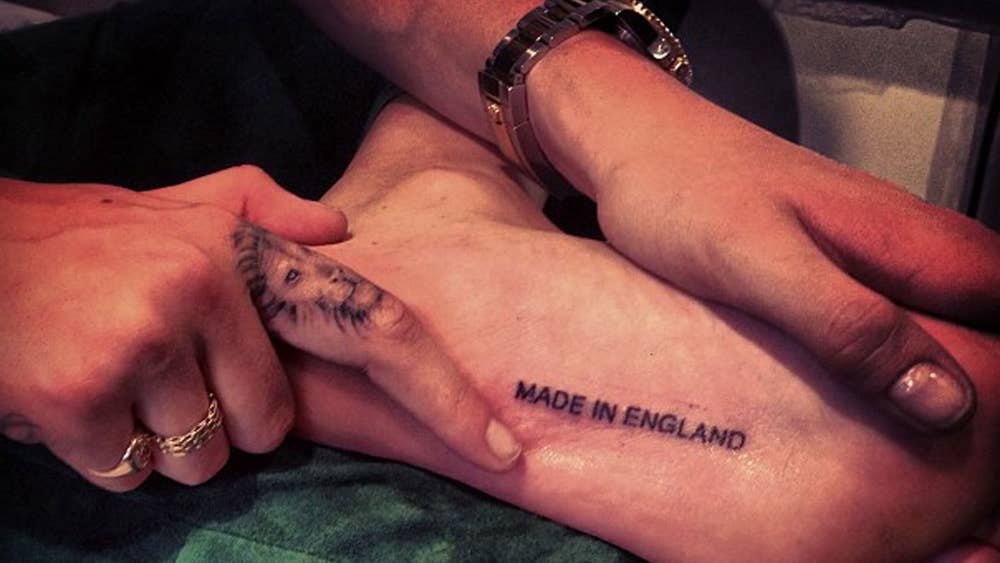 Which model has a "MADE IN ENGLAND" tattoo on the bottom of her foot?