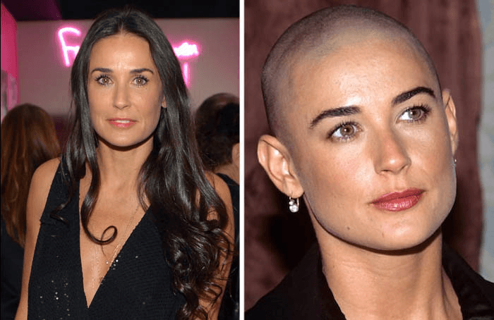 Слева у Деми Мур длинные прямые тёмные волосы, а слева Деми Мур лысая.