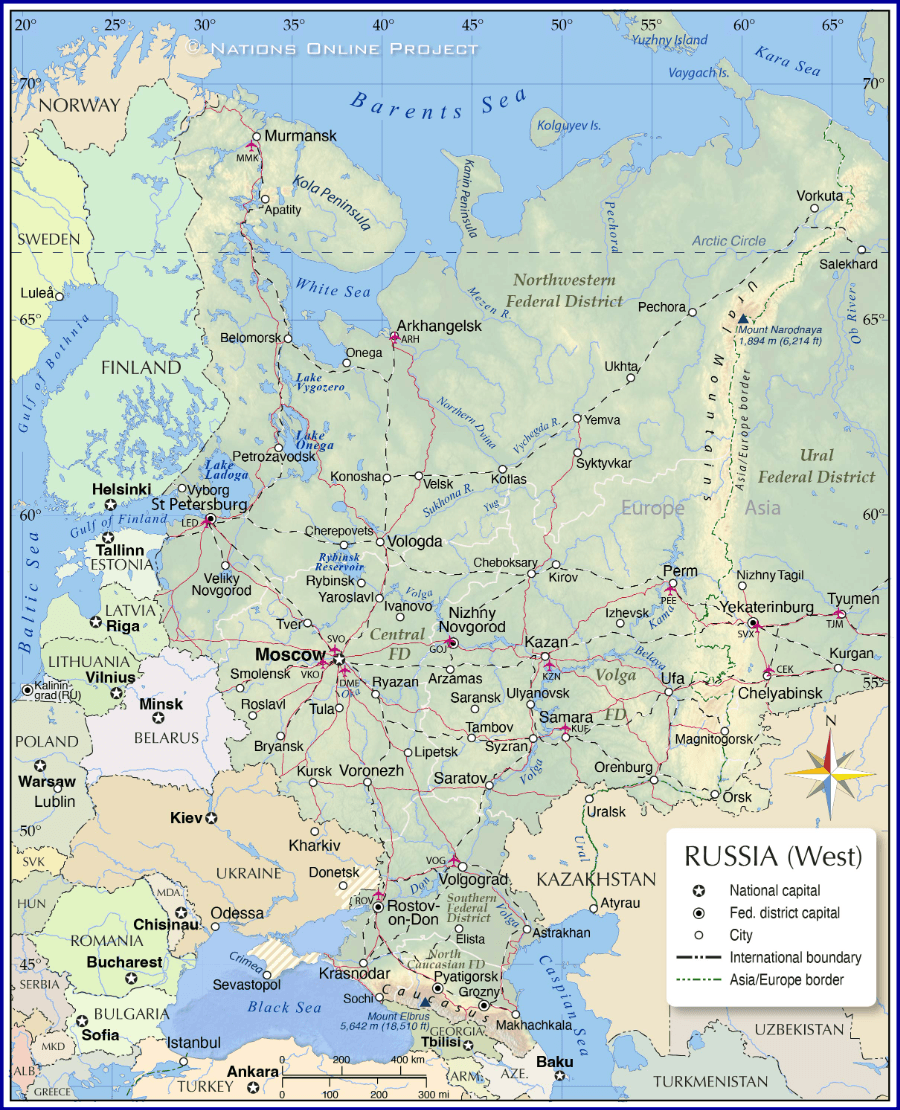Based on the map, which city is located outside of the boundary of present-day Russia?