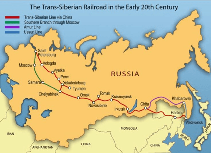 Based on the map, what is a reasonable motive for Russia to build the Trans-Siberian railway?