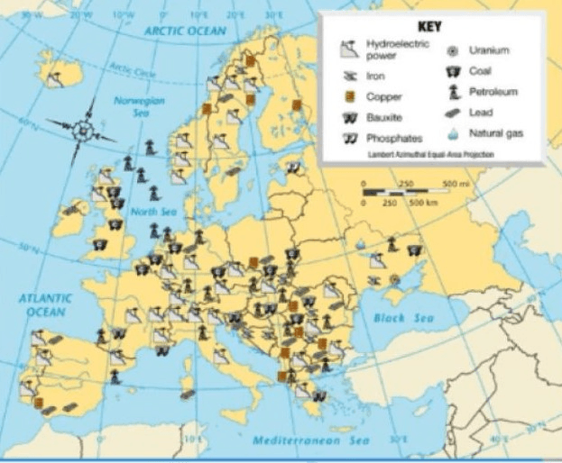 The map shows natural resources located in Russia and the European Republics. From this we can infer that economics in these regions rely on what industries?