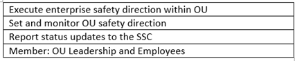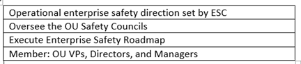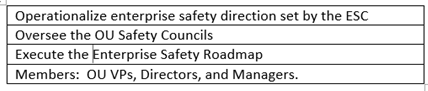 These Safety Councils have both employees and leadership on the council, but do not execute enterprise safety direction within the OU.