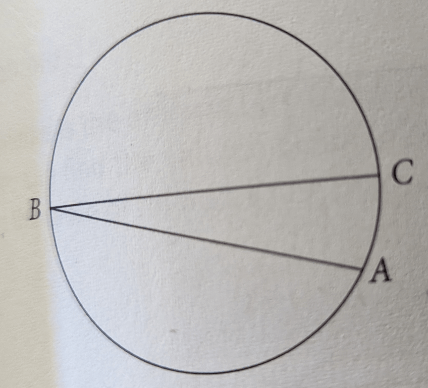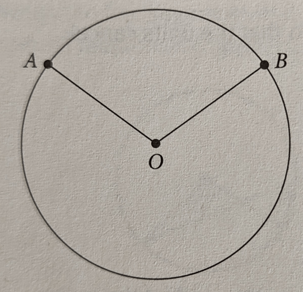 In the figure above, circle O has a radius of 120 centimeters. If the length of the minor (smaller) arc is 200 cm, what is the measure of the corresponding angle AOB? (Round to the nearest tenth of a degree.)