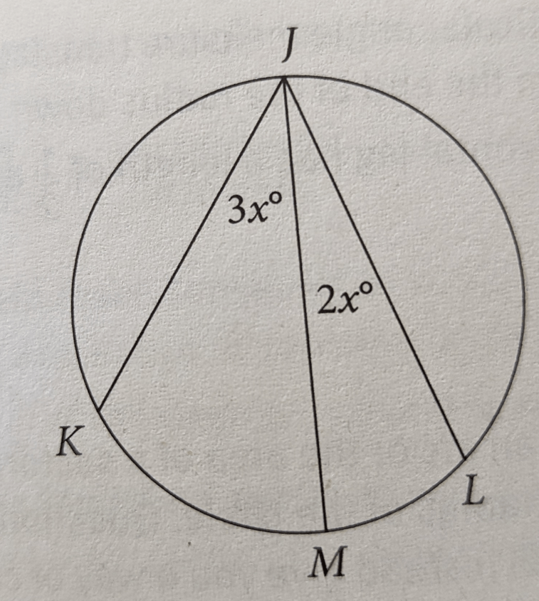 In the figure above, points J, K, L, and M lie on the circle. If the measure of arc KML is 150 degrees, what is the value of x?