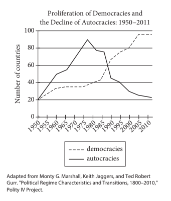 According to the graph, the number of autocracies in 1975 was less than the number of