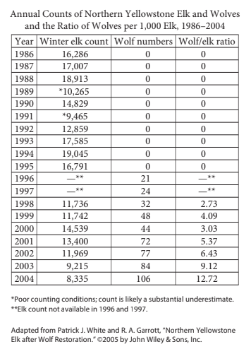 According to the table, the wolf/elk ratio experienced