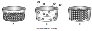 The diagram represents three phases of matter, labeled A, B, and C.