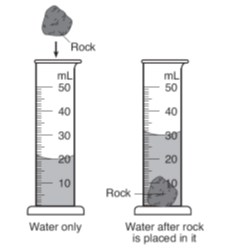 A student placed a rock in a graduated cylinder containing water, causing the water level in the cylinder to increase by 20 mL. This increase represents the rock’s