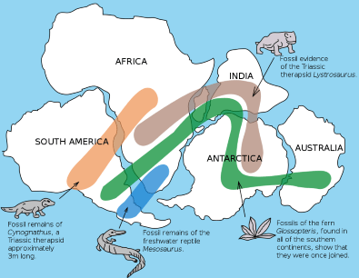Look at the fossil map of Glossopteris found in Antarctica, Africa, India, and South America.