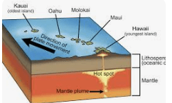 The plate moves, so older volcanoes drift away while new ones form above the hot spot.