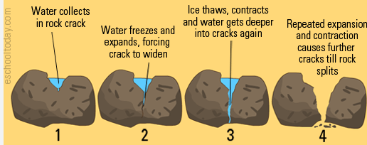 The diagram shows rain hitting rock and breaking it into smaller pieces without moving them.