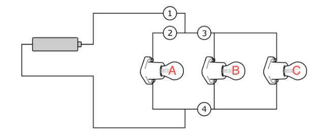 If this circuit was cut at spot 4, which lightbulb(s) if any would still be working?