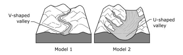 La forma de U es causada por los glaciares (hielo) y la forma de V es causada por un río (agua)