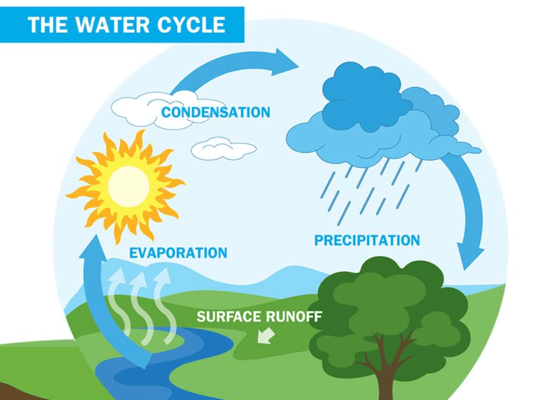 Dibuja el ciclo del agua incluyendo estas palabras: escorrentía, evaporación, precipitación, condensación