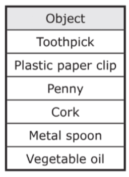 Possible answers: toothpick, plastic paper clip, cork, vegetable oil