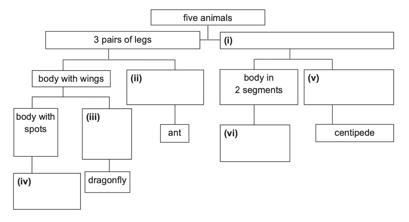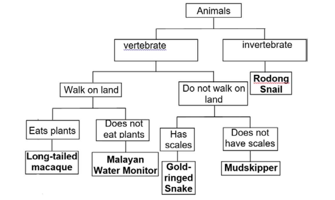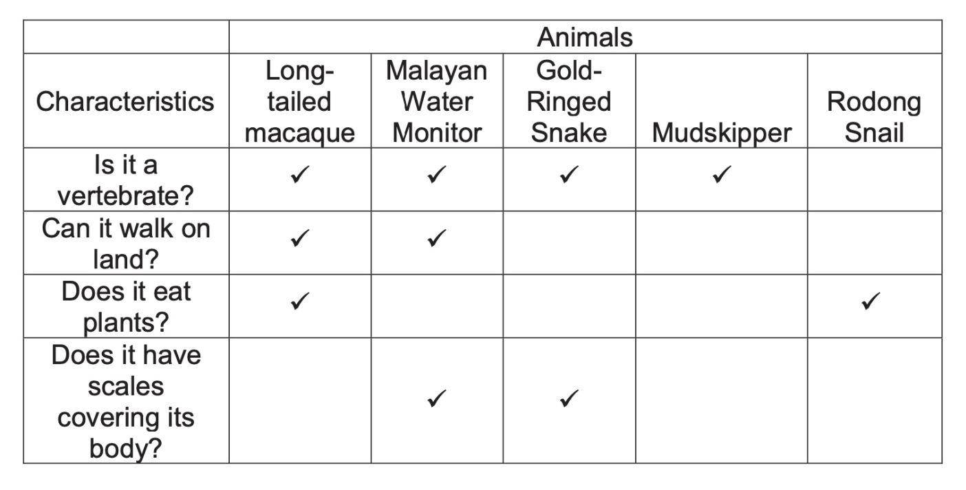 Complete the dichotomous key with the observable characteristics of the animals caught.